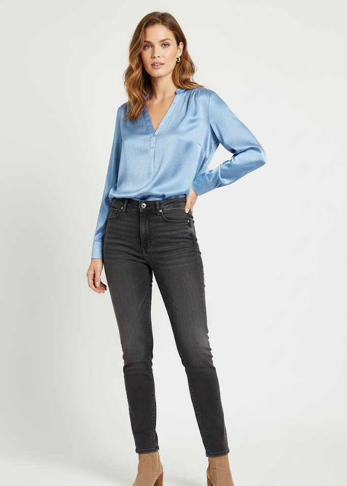 Esta elegante blusa de satén suave presenta un escote en V profundo y mangas largas con puños abotonados.