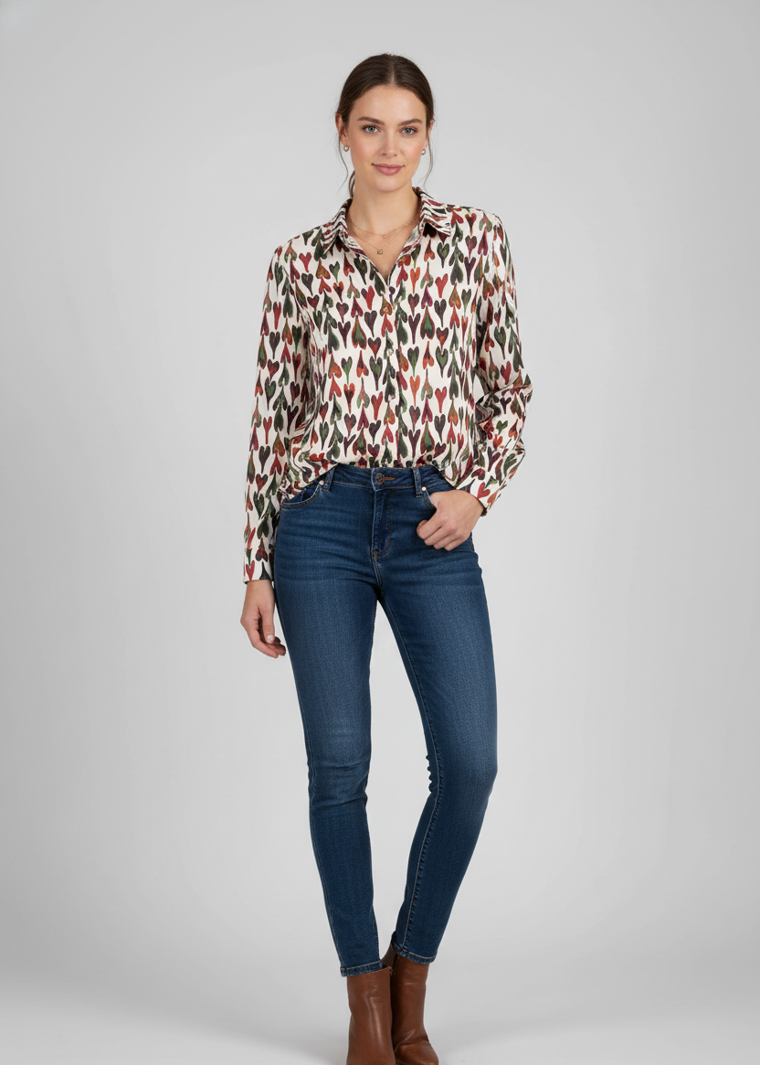 Esta camisa de manga larga con estampado de corazones combina un aire romántico con un diseño estructurado lleno de personalidad. Con su cuello camisero clásico, abotonado con solapa y detalles como la pinza en la espalda o la abertura lateral con botón, se convierte en una prenda especial y versátil para cualquier ocasión.