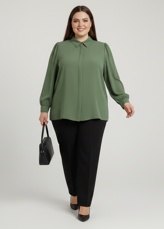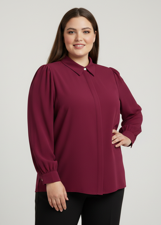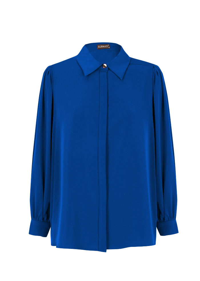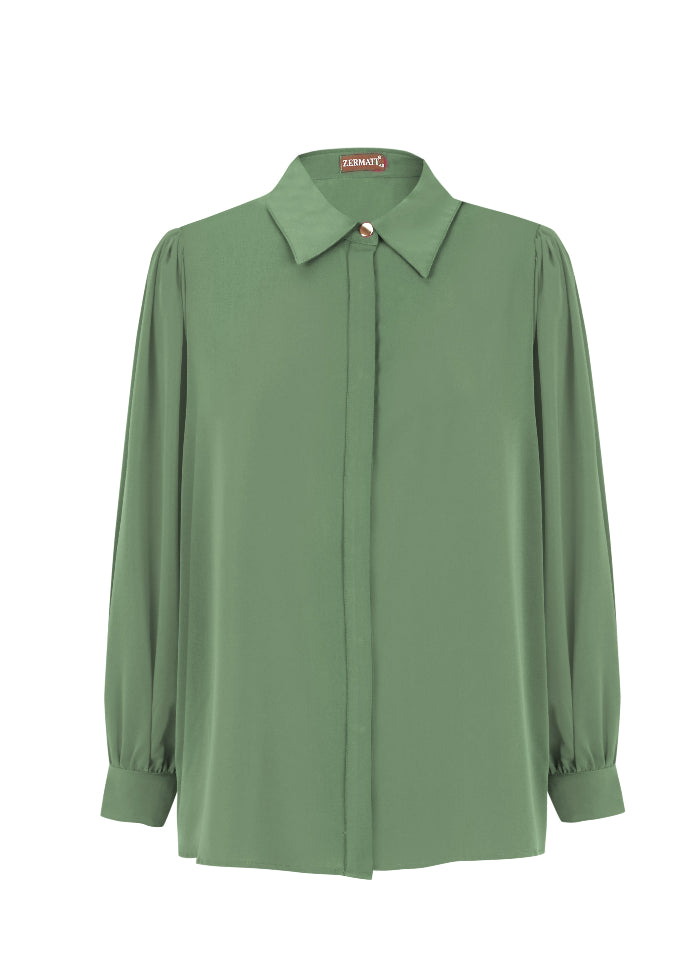 Camisa lisa de estilo elegante con cuello camisero y cierre abotonado oculto. Su diseño de manga larga y corte fluido ofrece comodidad y sofisticación a partes iguales. Ideal para looks de oficina, eventos o conjuntos más casuales, esta prenda es un fondo de armario versátil y atemporal.