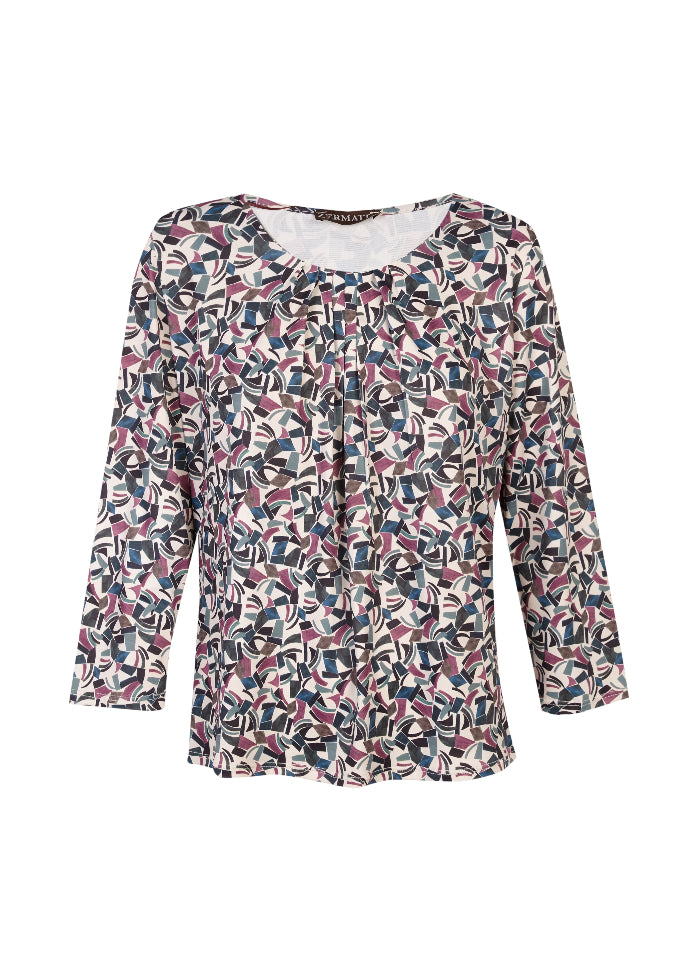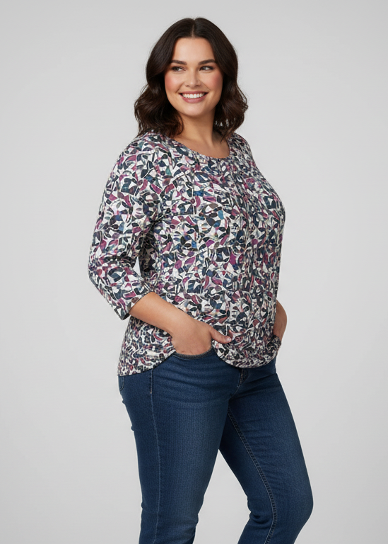 Camiseta ligera con un estampado moderno y cuello redondo con frunces que aportan un toque femenino. Su tejido suave y las mangas tres cuartos la convierten en una prenda cómoda y versátil, ideal para el día a día. Perfecta para combinar con vaqueros o pantalones de vestir y crear looks casuales con estilo.