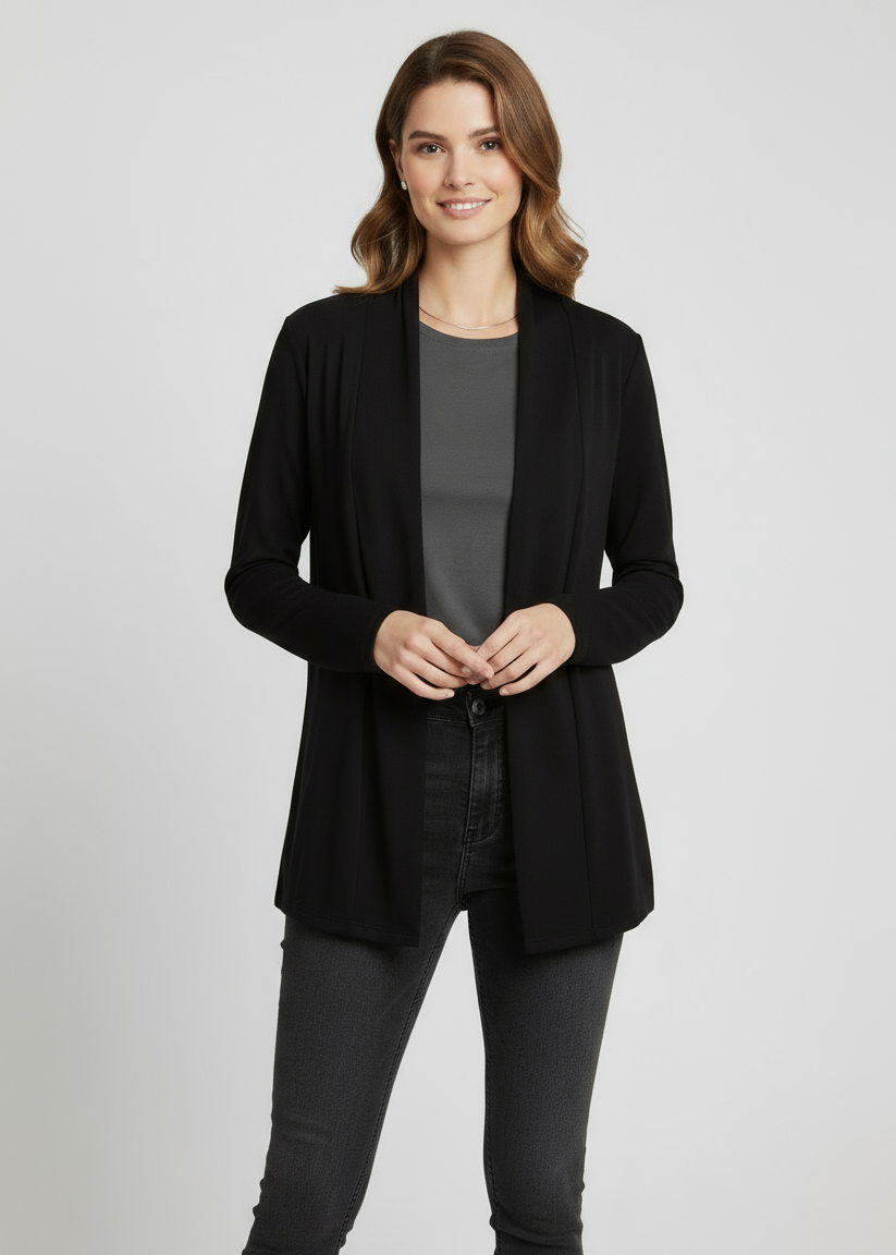 Esta chaqueta lisa de manga larga y diseño abierto es una prenda esencial para completar cualquier look con un toque sencillo pero elegante. Su corte limpio y su caída fluida la convierten en la aliada perfecta para entretiempo, oficina o looks casuales con un punto sofisticado.