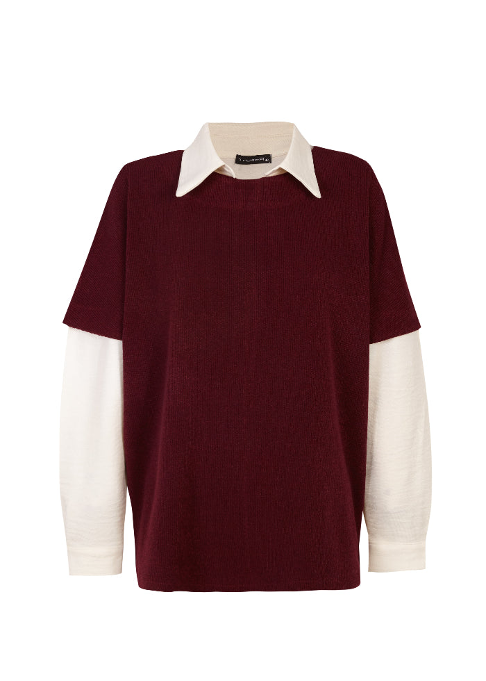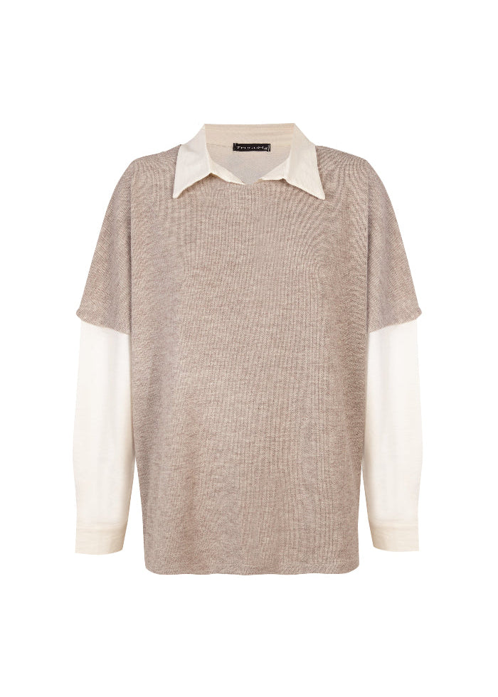 Blusisuéter de diseño moderno con cuello camisero y efecto dos piezas que combina el estilo de una blusa con la comodidad de un suéter. Su corte ancho ofrece libertad de movimiento y un ajuste relajado ideal para el día a día. La superposición de manga corta sobre larga aporta un toque original y actual, perfecto para looks casuales con un punto sofisticado.