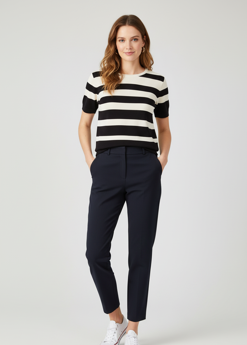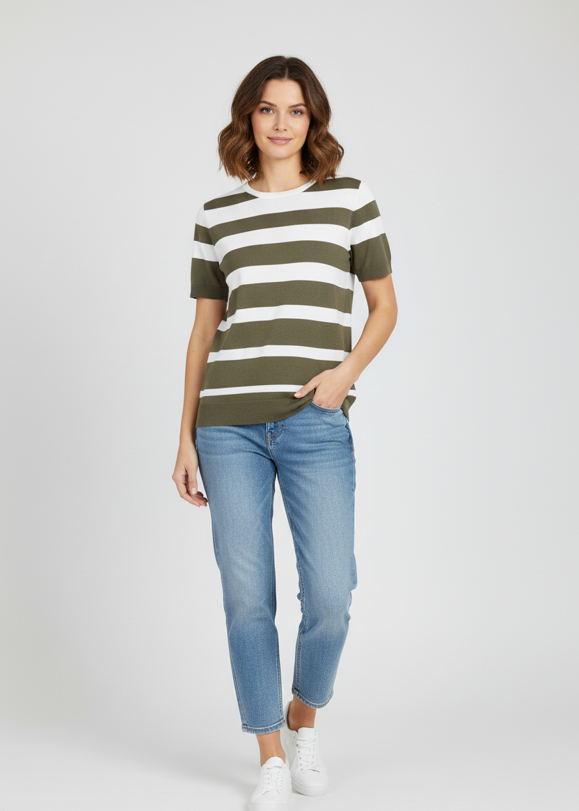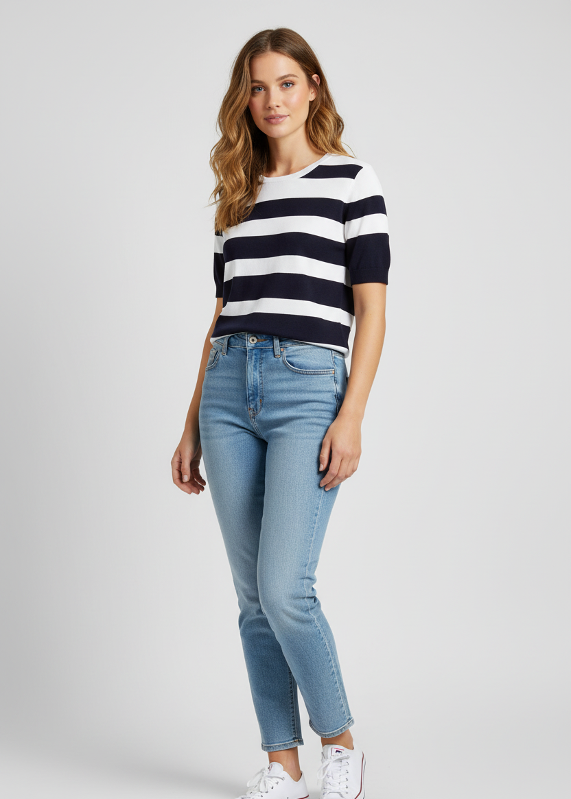 Este jersey de rayas bicolor con cuello redondo y manga corta es la prenda ideal para entretiempo. Un diseño sencillo pero con mucha personalidad que se adapta a cualquier estilo, desde el más casual hasta el más sofisticado.