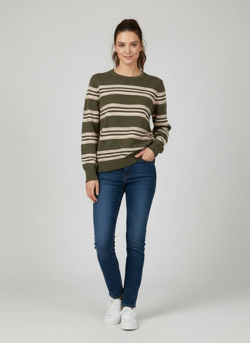 Jersey de rayas verde. Cuello redondo y manga larga. Puño cerrado.