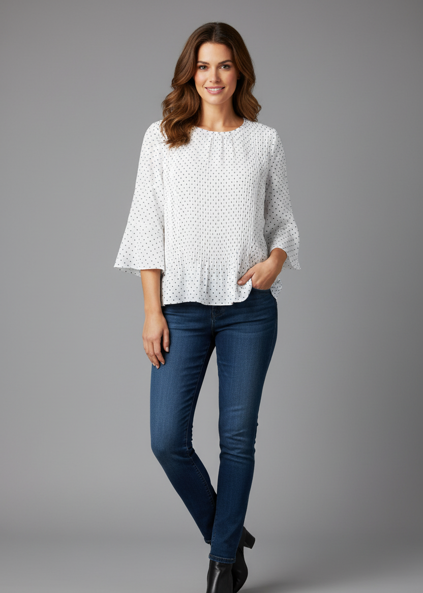 Blusa plisada con estampado de lunares, cuello redondo y manga 3/4, ideal para un look elegante y moderno. La manga cuenta con un delicado volante en la parte lisa, aportando un toque femenino y sofisticado. Perfecta para combinar con diferentes estilos y ocasiones.