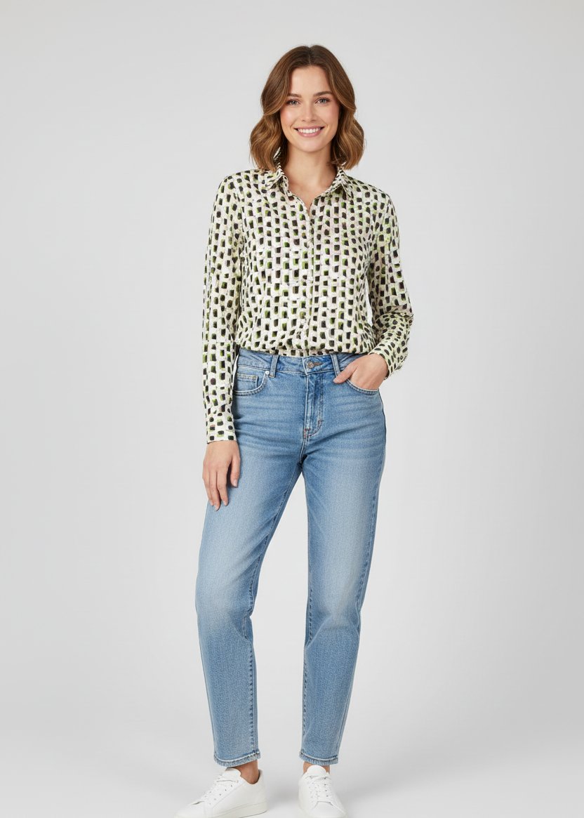 Camisa estampada abotonada en color fucsia o verde, Manga larga y cuello camisero,