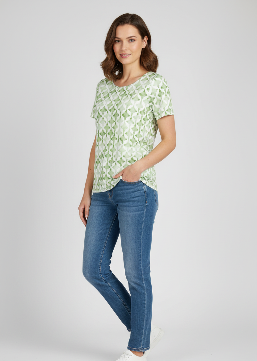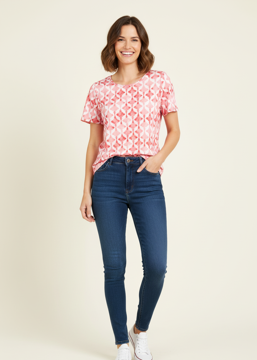 Camiseta estampada de estilo casual, con cuello redondo y manga corta. Su diseño único y moderno la convierte en la prenda perfecta para cualquier ocasión informal. Cómoda, versátil y fácil de combinar, ideal para un look fresco y relajado.