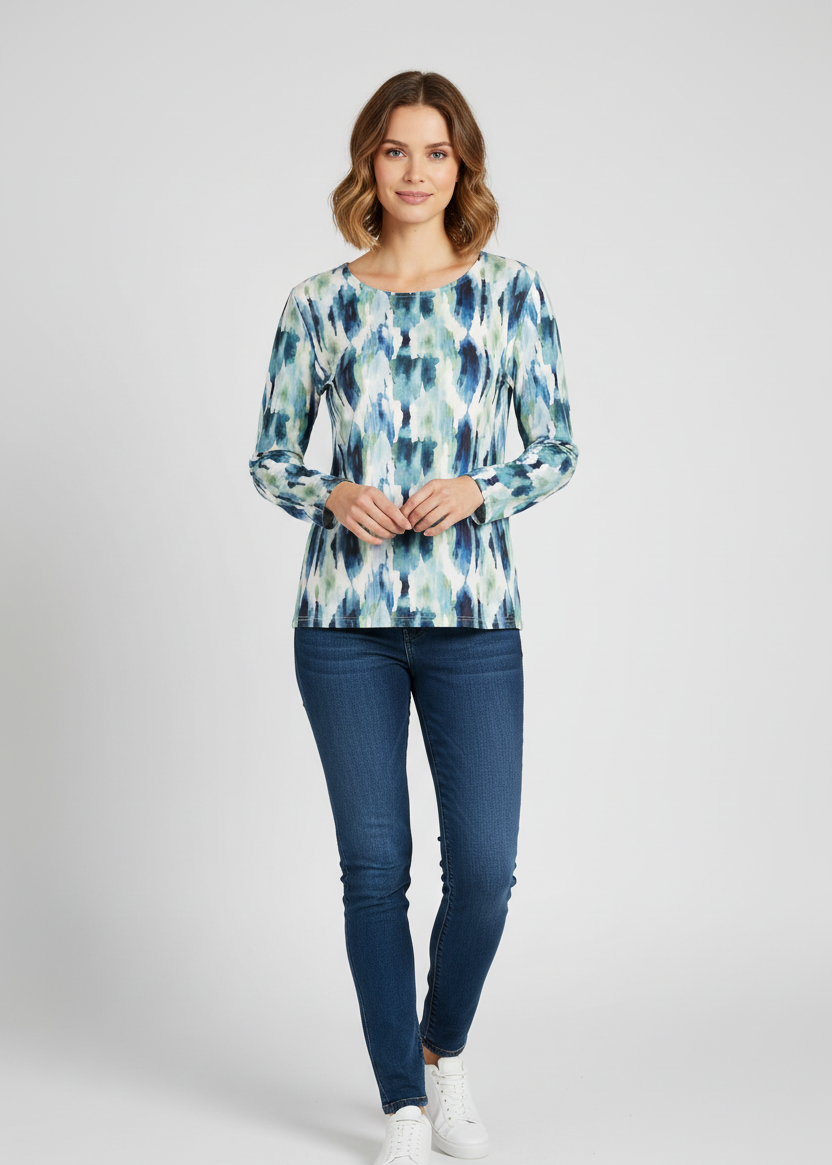 Camiseta de lanilla con un elegante estampado acuarela, cuello redondo y manga larga. Su diseño único y suave textura la convierten en la opción perfecta para un look cómodo y estilizado en días frescos.