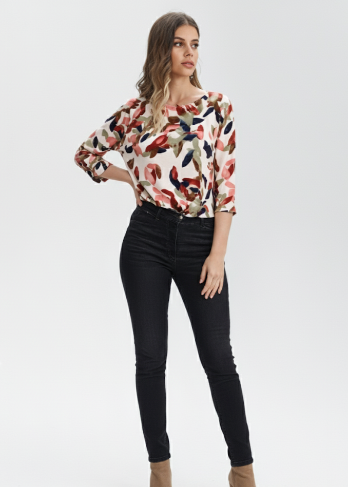Camiseta estampada de flores, cuello redondo y manga 3/4