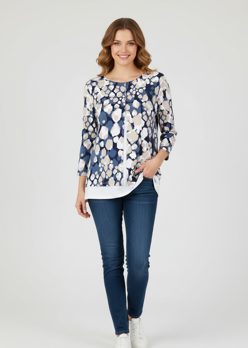 Falso conjunto estampado con interior blanco liso, cuello redondo con botón y manga 3/4. Un diseño innovador que combina estilo y comodidad, ideal para quienes buscan una prenda versátil y moderna para su día a día. Perfecta para darle un toque único a tu look.