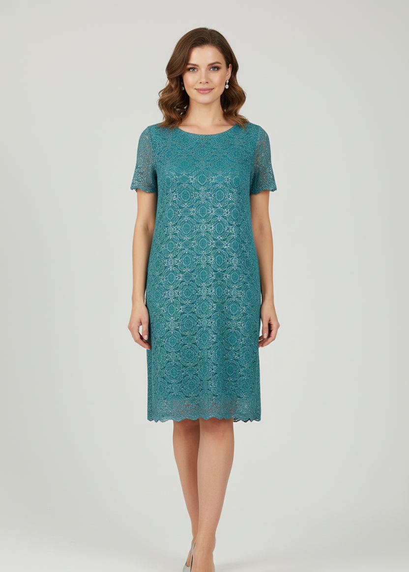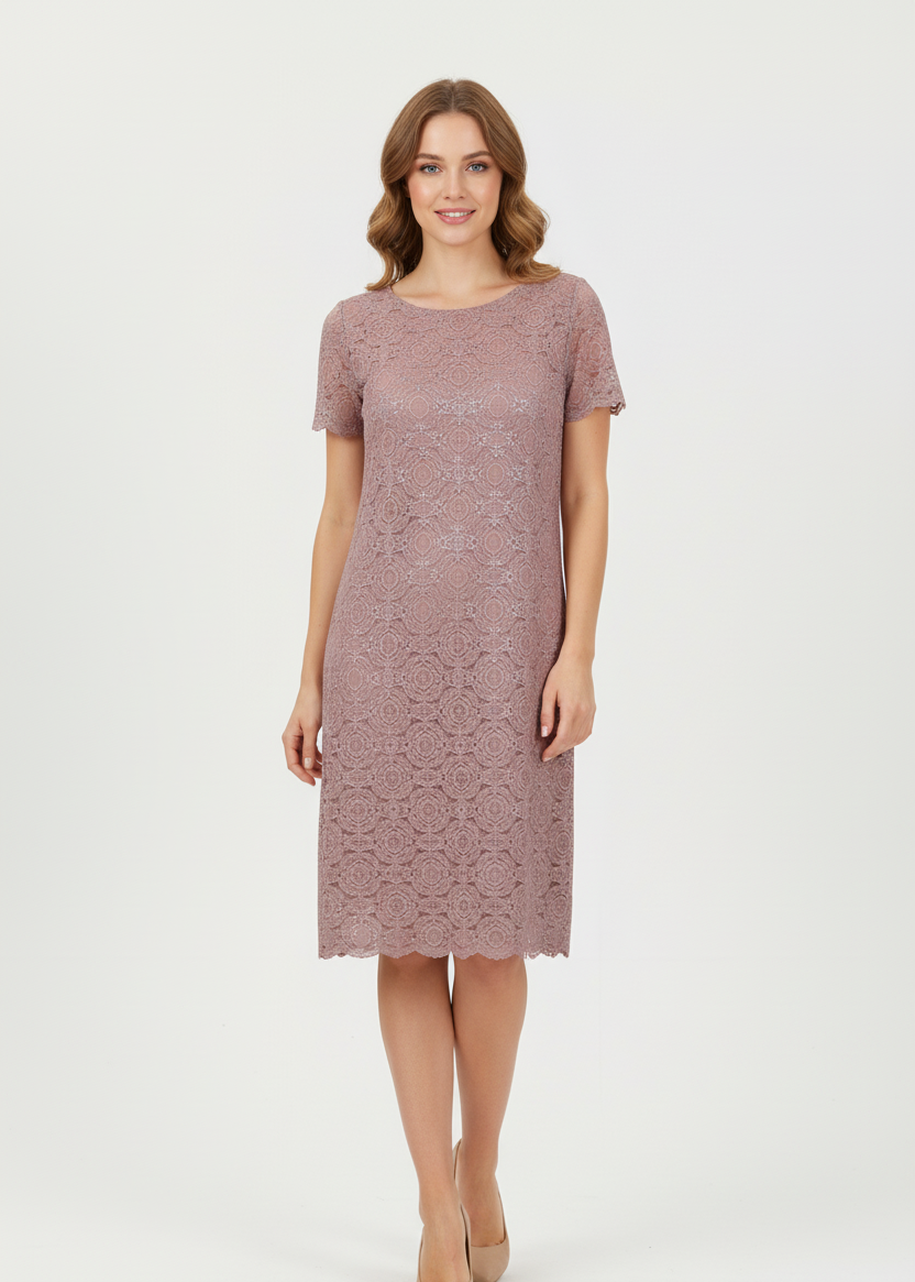 Este elegante vestido de encaje presenta un diseño de manga corta y un patrón intrincado de círculos y flores. Ideal para ocasiones especiales, su tejido ligero y delicado ofrece un toque sofisticado y femenino.
