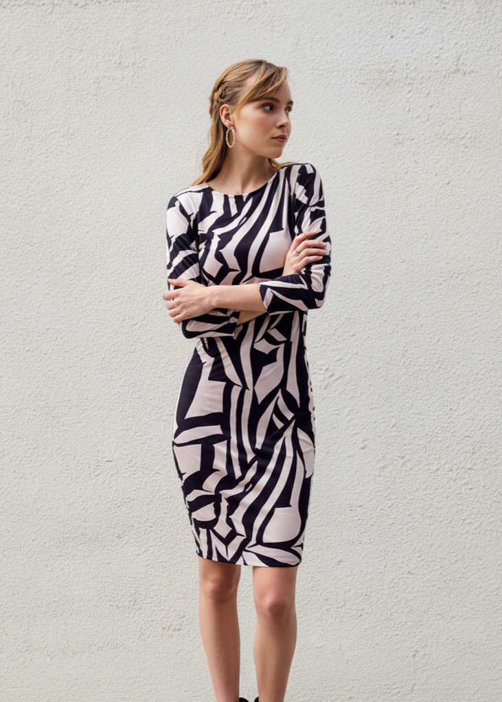 Vestido midi con cuello redondo y manga larga. Disponible en dos tonos.