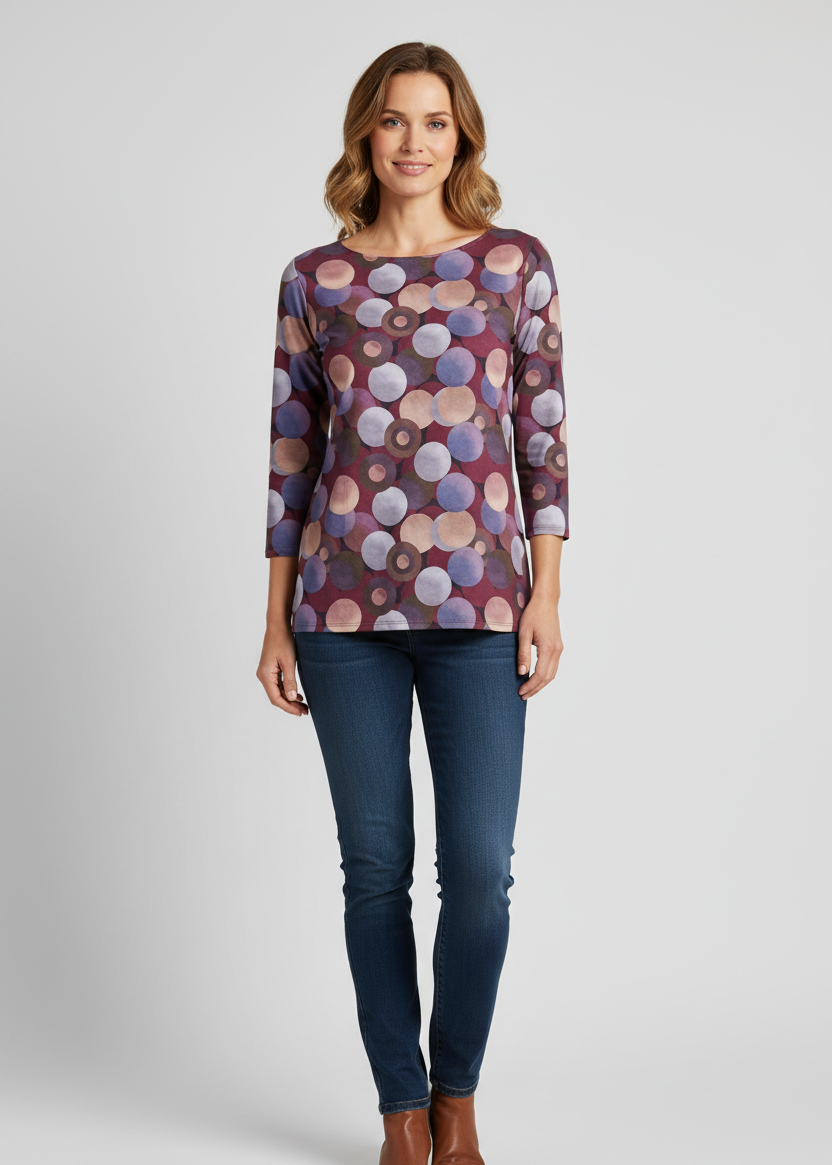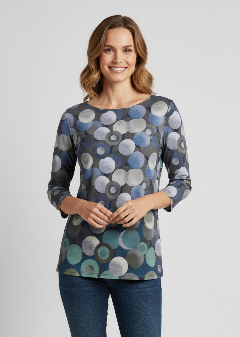 Original y fácil de combinar, esta blusa de estampado de círculos, con cuello redondo y manga 3/4, es perfecta para añadir un toque gráfico y moderno a tu día a día. Su diseño cómodo y favorecedor la convierte en una prenda imprescindible para entretiempo.