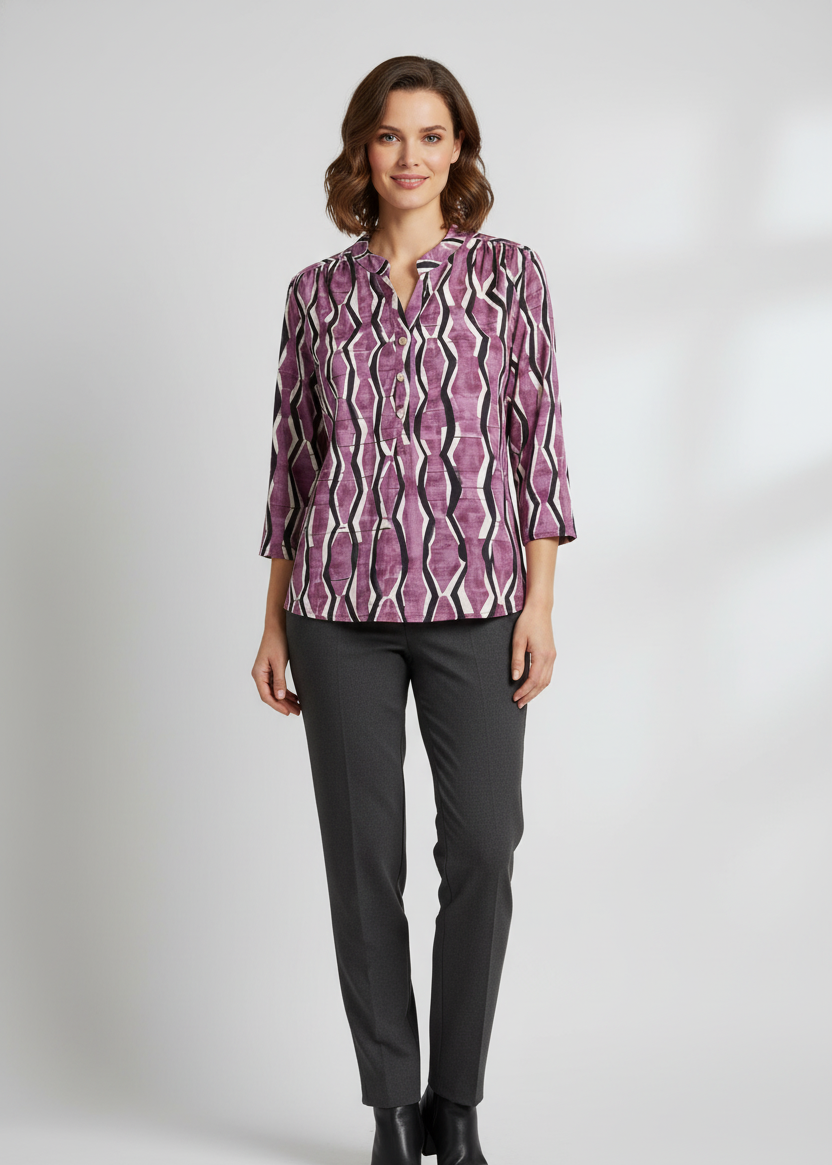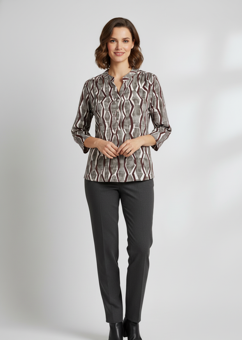 Esta blusa de cuello tirilla, con botones en el pecho y manga 3/4, es una prenda sutil pero con carácter. Su diseño limpio y elegante la convierte en una opción ideal tanto para el día a día como para looks más pulidos.