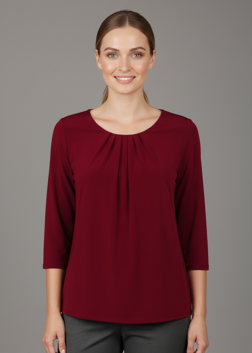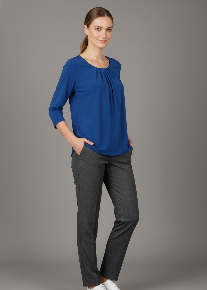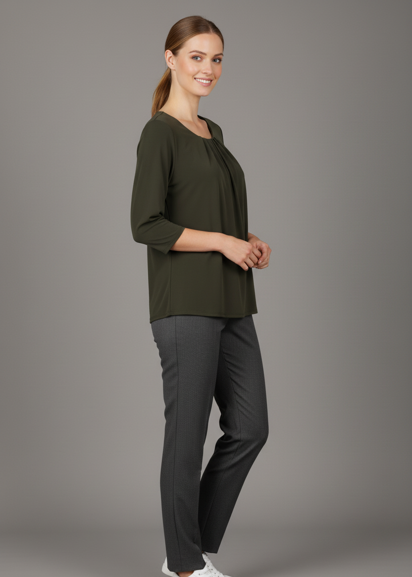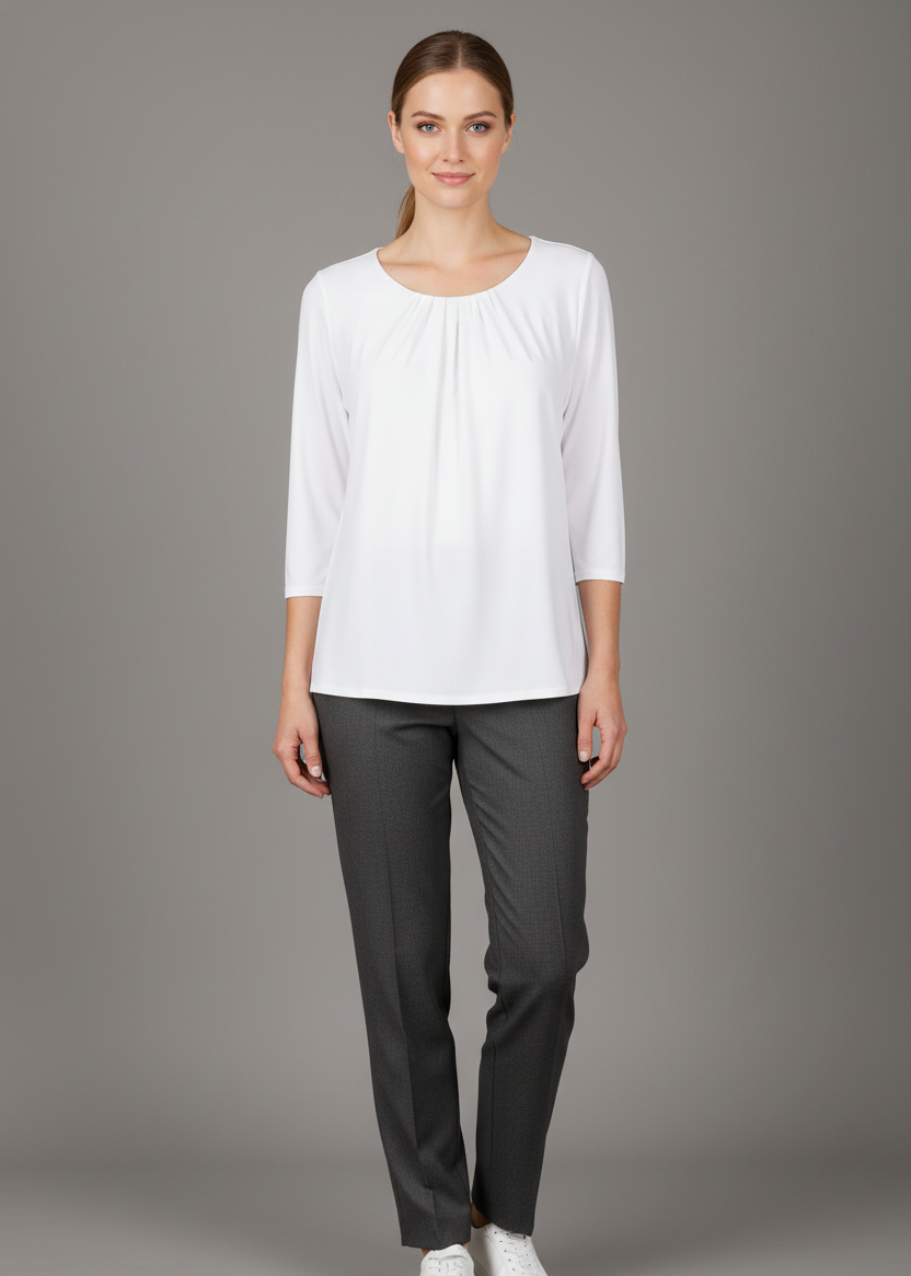 Una prenda básica, pero con un giro sutil: esta camiseta lisa con frunce en el cuello redondo aporta un toque femenino y delicado a cualquier look. Su manga 3/4 la convierte en una opción perfecta para el entretiempo o para llevar todo el año.