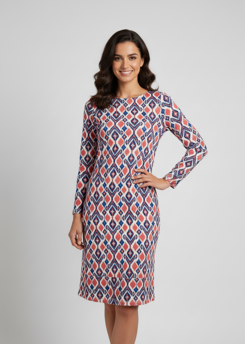Este vestido de lanilla con estampado de rombos combina comodidad y estilo. Con cuello redondo y manga larga, es perfecto para los días más frescos, ofreciendo un look elegante y moderno para cualquier ocasión.