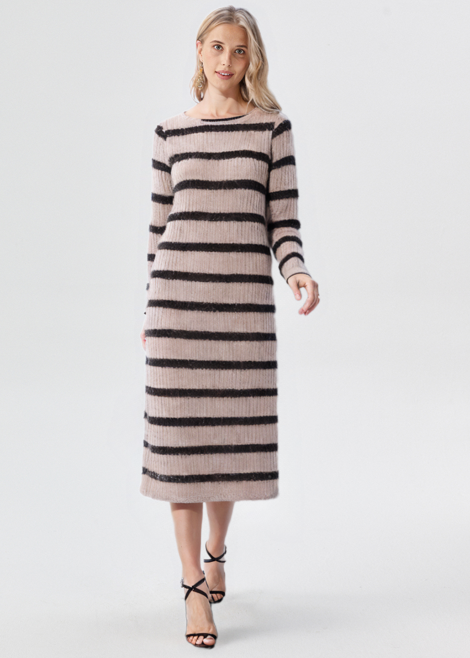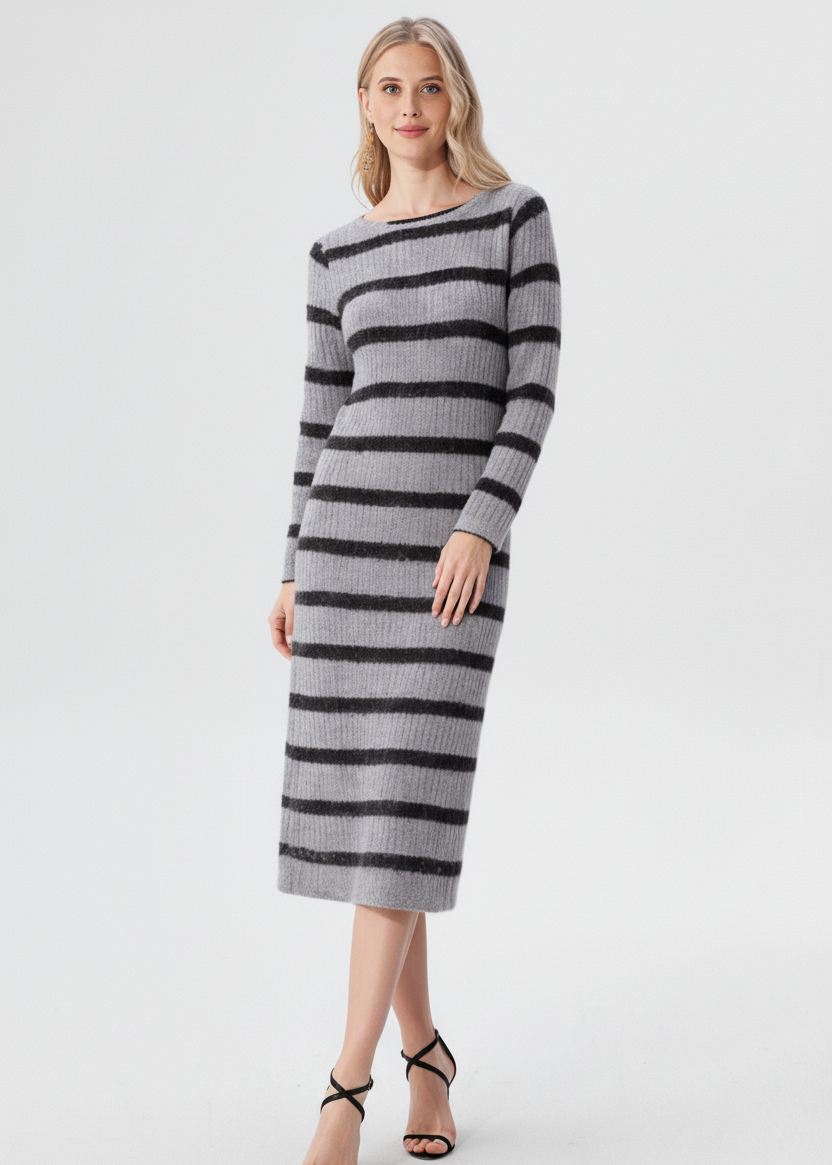 El Vestido Largo de Rayas Canalé Lurex con cuello redondo y manga larga es la combinación perfecta de elegancia y comodidad. Su diseño entallado en tejido canalé con detalles de lurex aporta un toque de brillo y sofisticación, ideal para lucir en eventos especiales o para un look chic en el día a día.