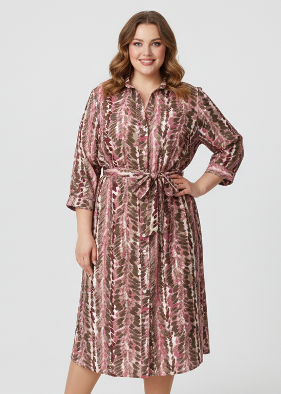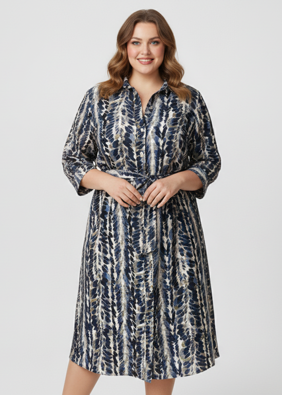Vestido camisero fluido con un estampado moderno que aporta dinamismo y estilo. Su corte midi y el cinturón ajustable en la cintura realzan la figura de forma natural. Una prenda versátil y cómoda, perfecta para combinar con calzado plano o de tacón y adaptarse a cualquier ocasión.