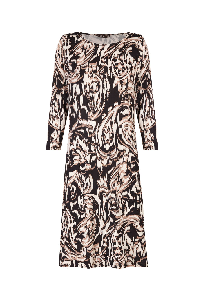 Vestido de corte recto con estampado abstracto que aporta un toque artístico y moderno. Su cuello redondo y las mangas tres cuartos ofrecen una silueta equilibrada y cómoda. Ideal para crear looks elegantes sin renunciar a la comodidad, tanto para el día a día como para ocasiones especiales.