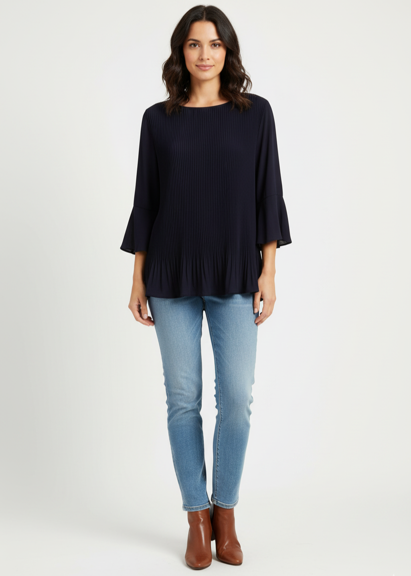 Blusa plisada en color azul marino. Mangas con vuelo.