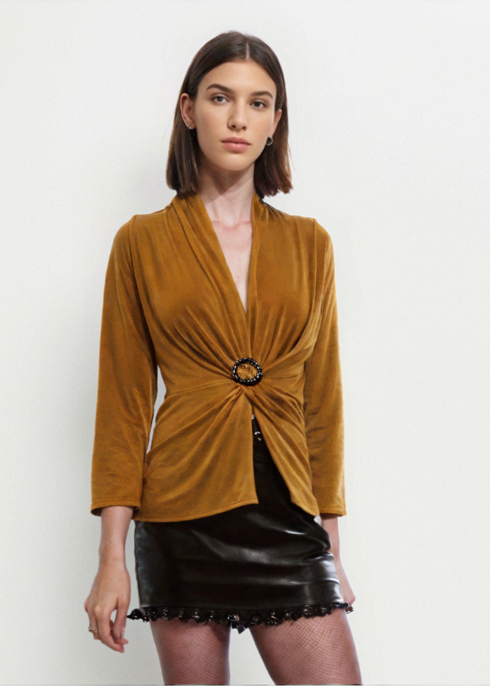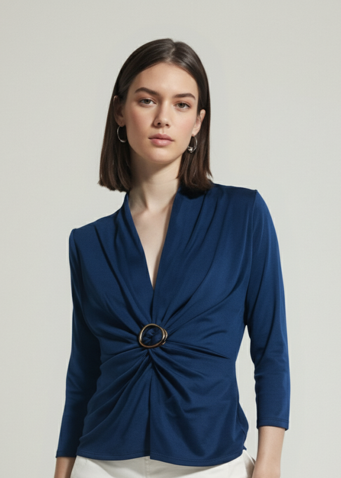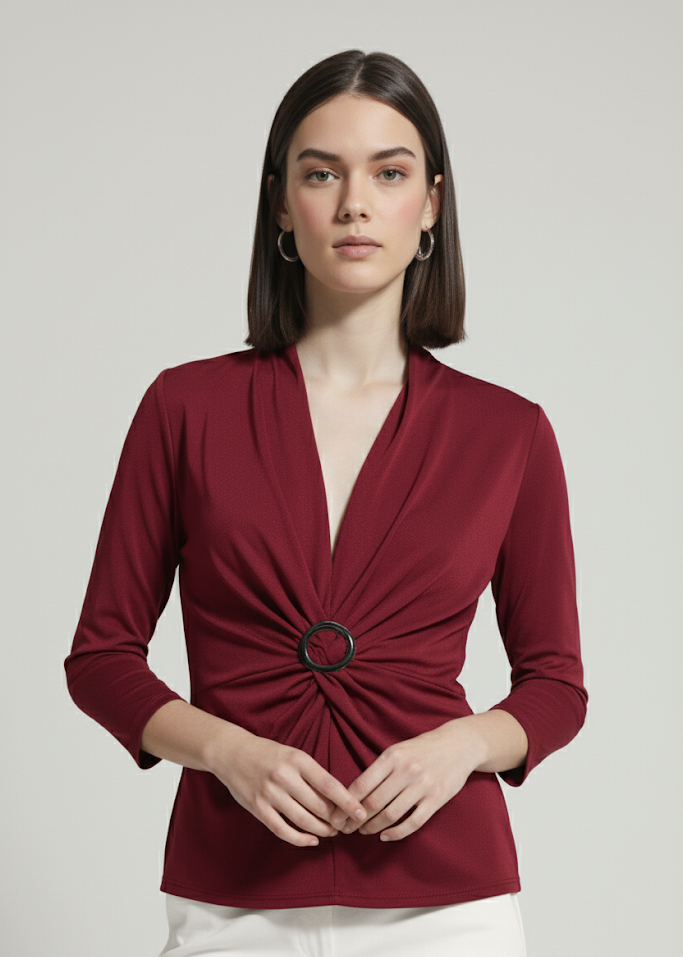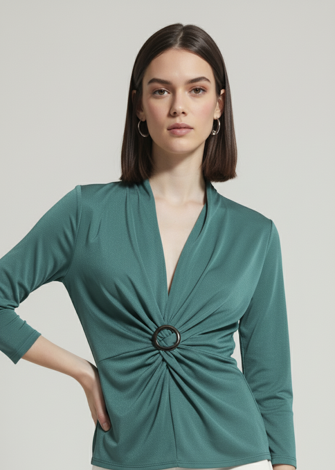 Camiseta lisa de escote de pico. Hebilla en el centro con manga 3/4