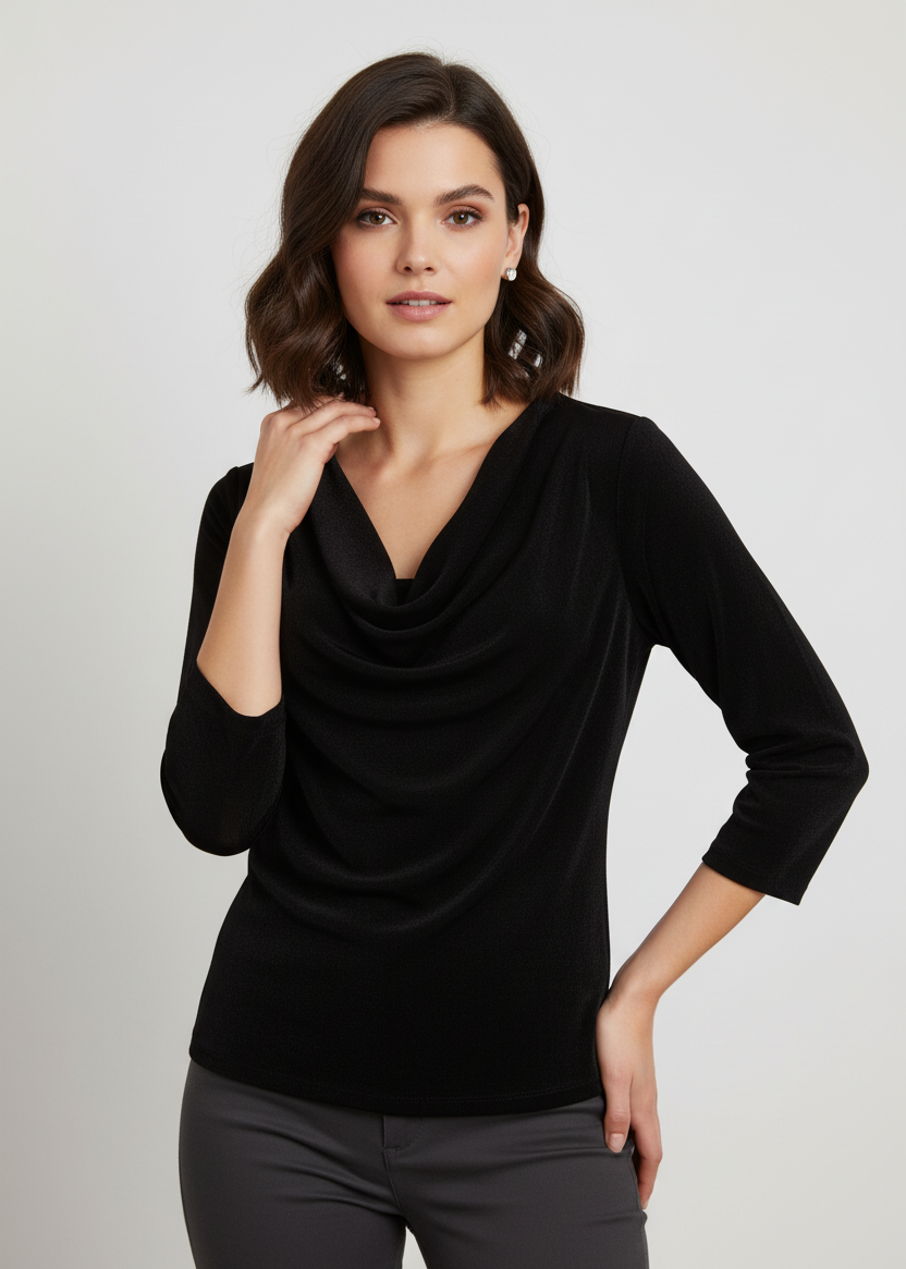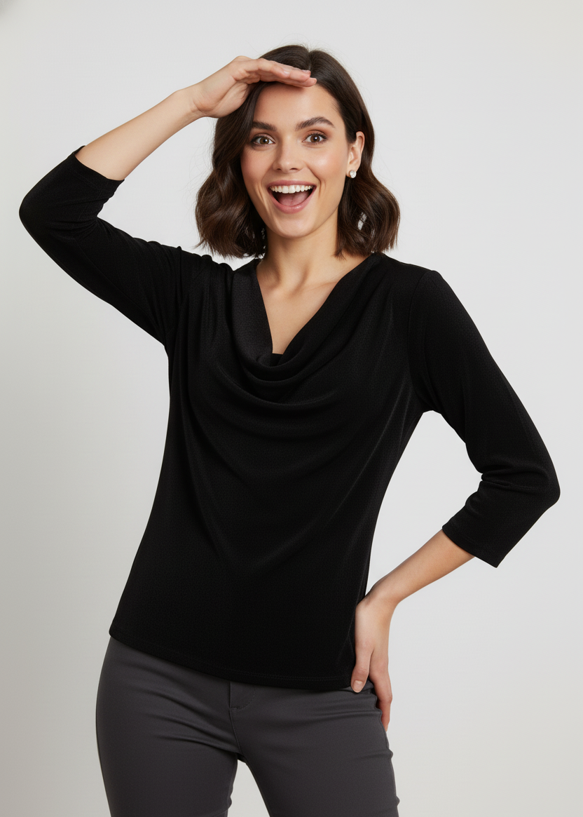Camiseta lisa negra de manga 3/4. Cuello redondo caído.