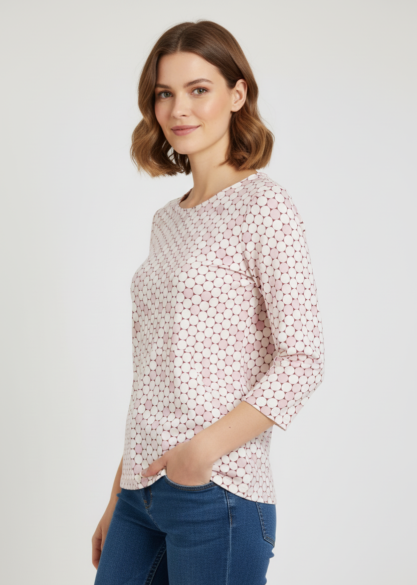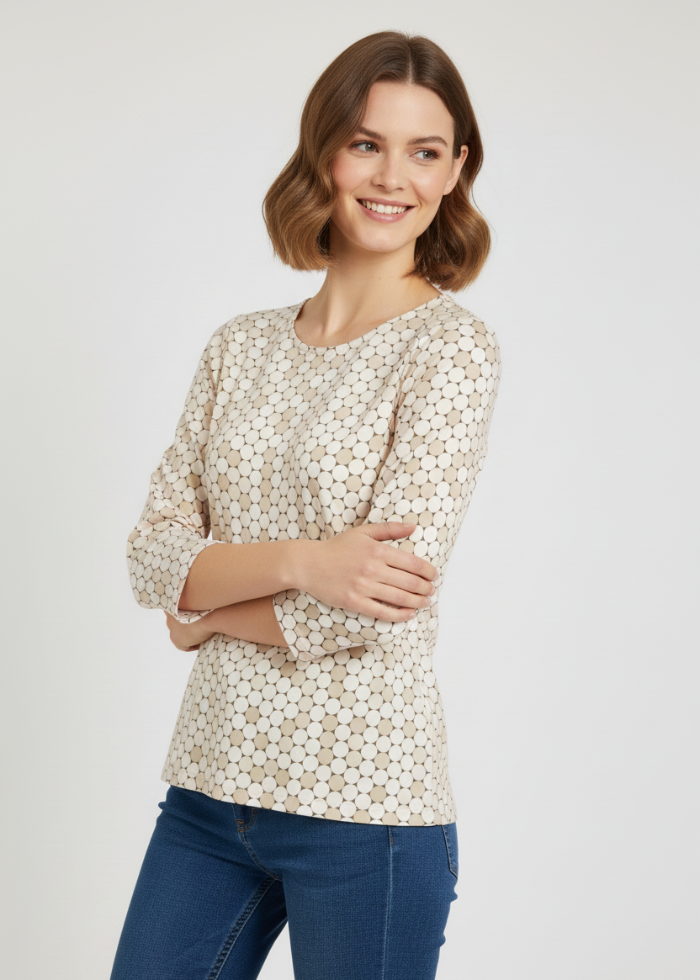 Camiseta de lunares con cuello redondo y manga 3/4, perfecta para un look fresco y elegante.