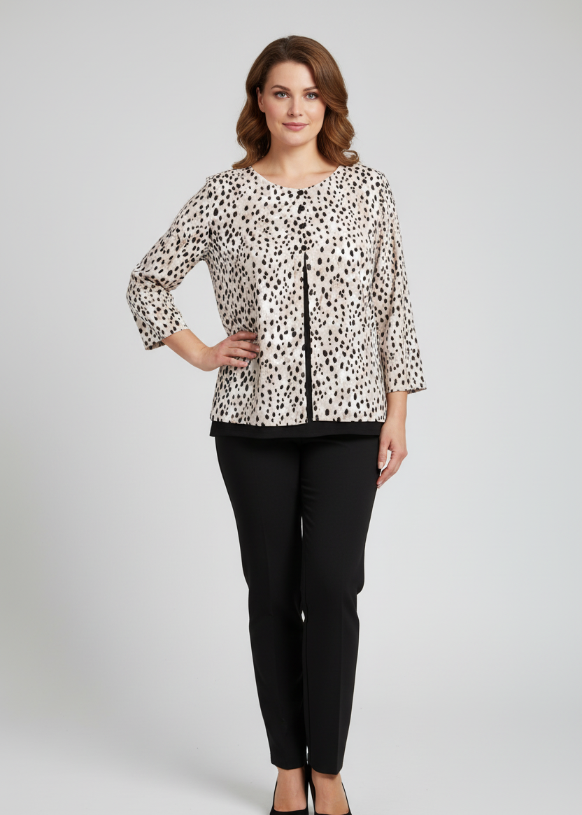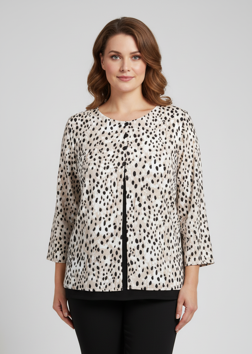 Esta blusa de estampado de manchas, con falso conjunto interior liso, combina originalidad y comodidad en una sola prenda. El cuello redondo, la manga 3/4 y los botones con abertura frontal aportan un aire moderno y funcional, perfecto para quienes buscan un look cuidado sin complicaciones.