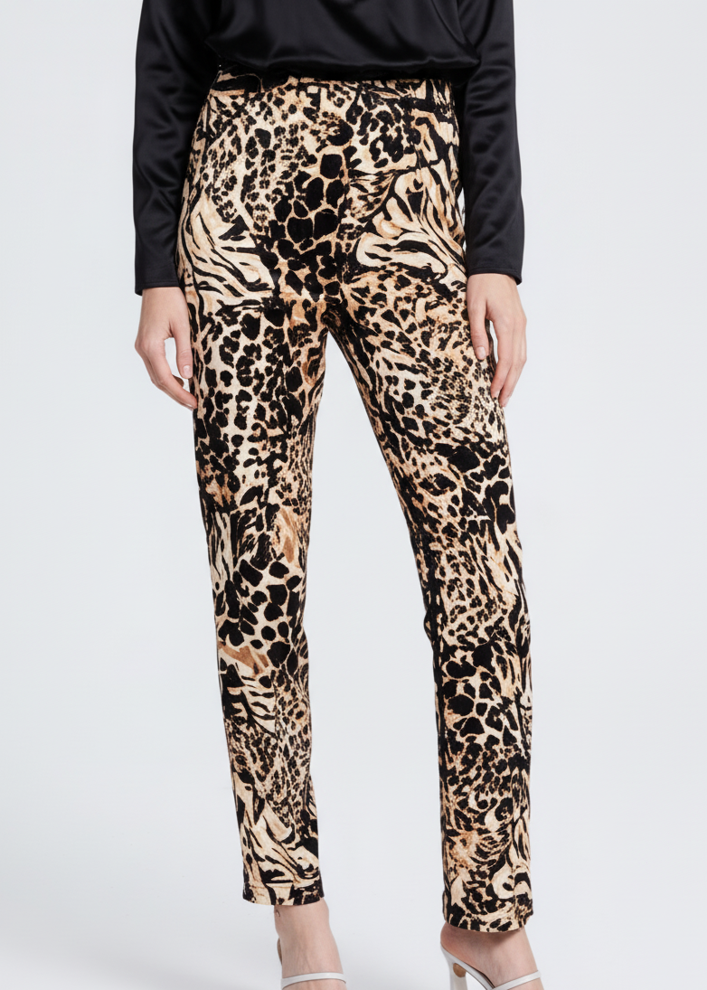 Pantalón de leopardo de pernera ancha. Cintura de goma ancha.